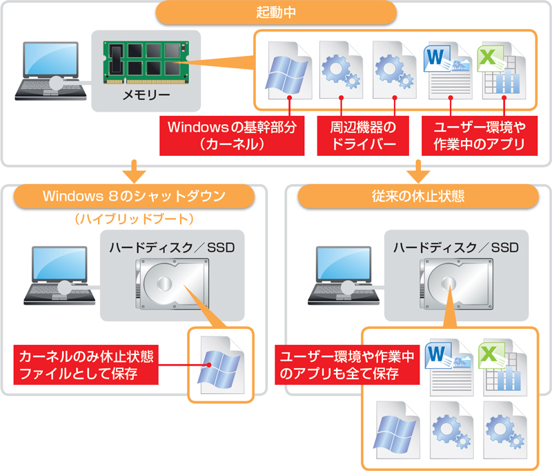 図1 ハイブリッドブートは、従来のシャットダウンと休止状態の特徴を併せ持つ方式。Windowsの基幹部分(カーネル)だけを休止状態ファイルとしてハードディスクに保存する。このため、従来の休止状態より少し速く終了できるメリットもある