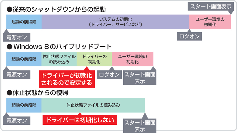この問題を解決するのがハイブリッドブートだ。休止状態並みの起動時間を確保しつつ、不安定にならないようにする。具体的には、Windowsのカーネ ル部分だけを休止状態ファイルとして保存してから電源を切る。ドライバーやユーザー環境などは保存しないので、休止状態ファイルの●従来のシャットダウン と休止状態は設定変更で呼び出す容量が小さくなるのも利点だ(図1)。この状態からパソコンを起動すると、BIOSの初期化などの前処理をした後、休止状 態ファイルを読み込み、その後ドライバーの初期化が行われる。これで完全にシャットダウンしたときよりも速く、しかも安定した状態で起動できる(図2)。